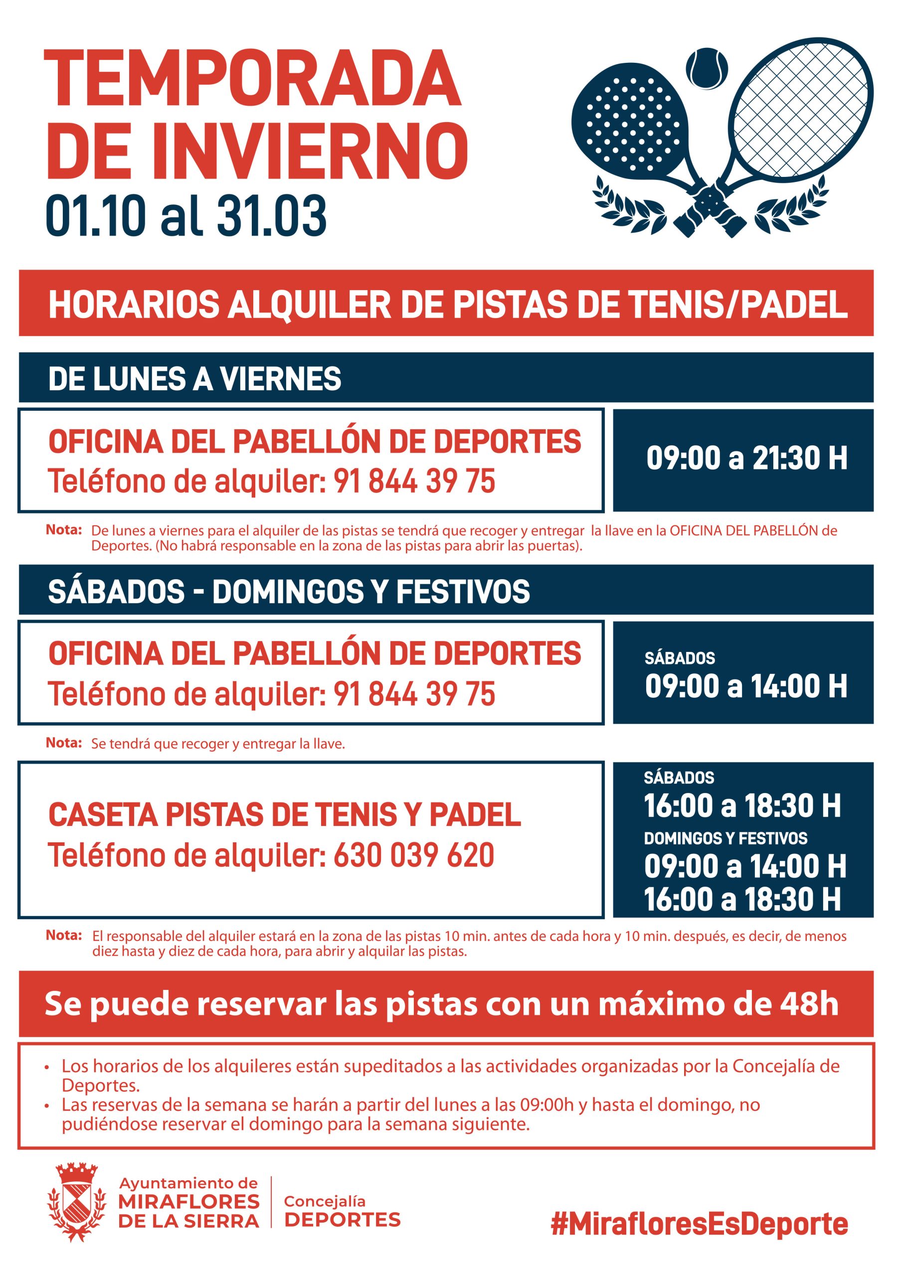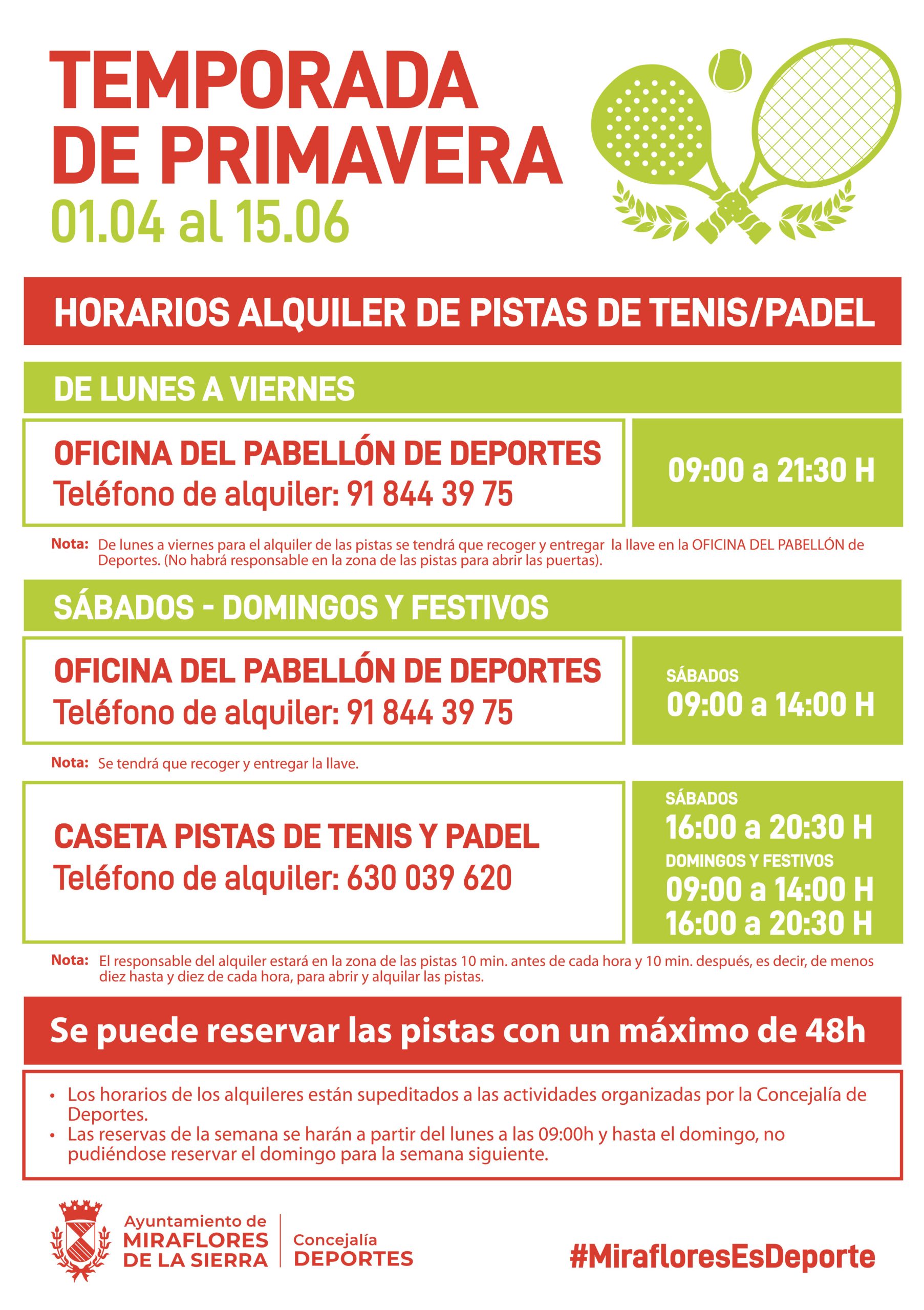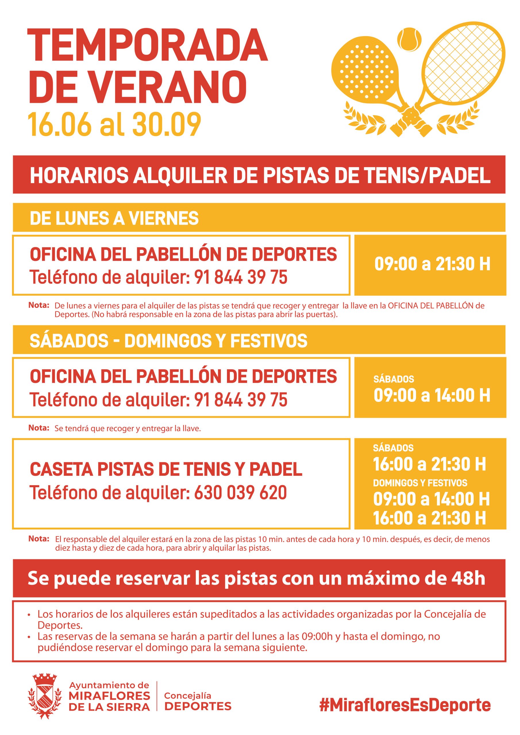 | PISTAS DE PADEL Y TENIS: Tel. de lunes a viernes: 91 844 39 75 – tel. fin de semana:630 03 96 20 |