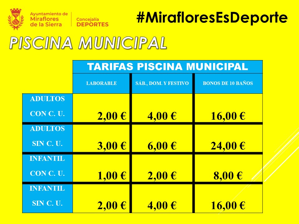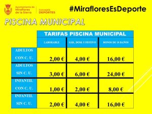 - Mayores de65 años No Empadronados en Miraflores de la Sierra: Acceso gratuito a la piscina municipal, 50% de descuento en el gimnasio de musculación y 50% de descuento en uno de los grupos de las actividades organizadas para dicho colectivo.