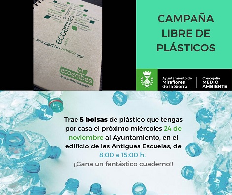 Trae 5 bolsas de plástico que tengas por casa el próximo miércoles 24 de noviembre al Ayuntamiento, en el edificio de las Antiguas Escuelas, de 8:00 a 15:00 h. y te lo cambiamos por un cuaderno de hojas recicladas, una buena práctica de economía circular.