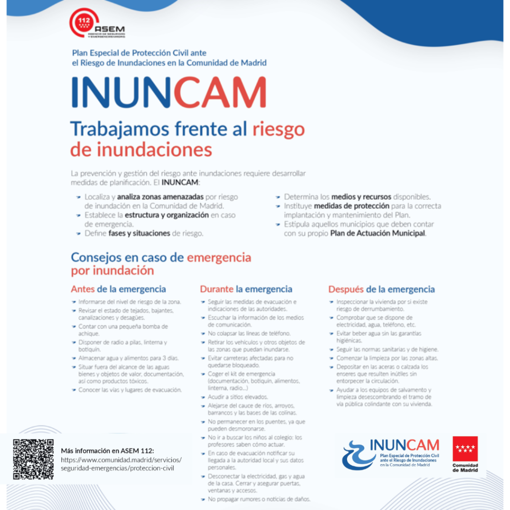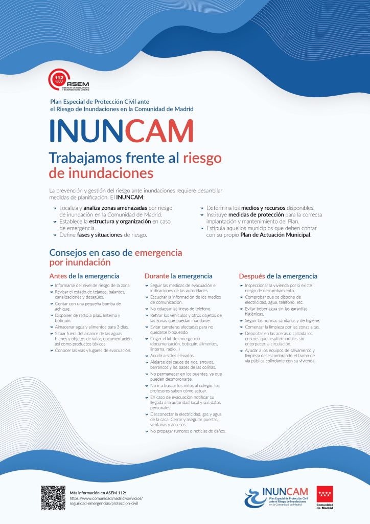 👉 Dentro de la implantación del Plan Especial de Protección Civil ante inundaciones en la Comunidad de Madrid (INUNCAM), la Subdirección General de Protección Civil ha elaborado material informativo y divulgativo sobre el INUNCAM. Aquí os dejamos el folleto informativo, y un poco más abajo podéis encontrar el cartel y el vídeo.