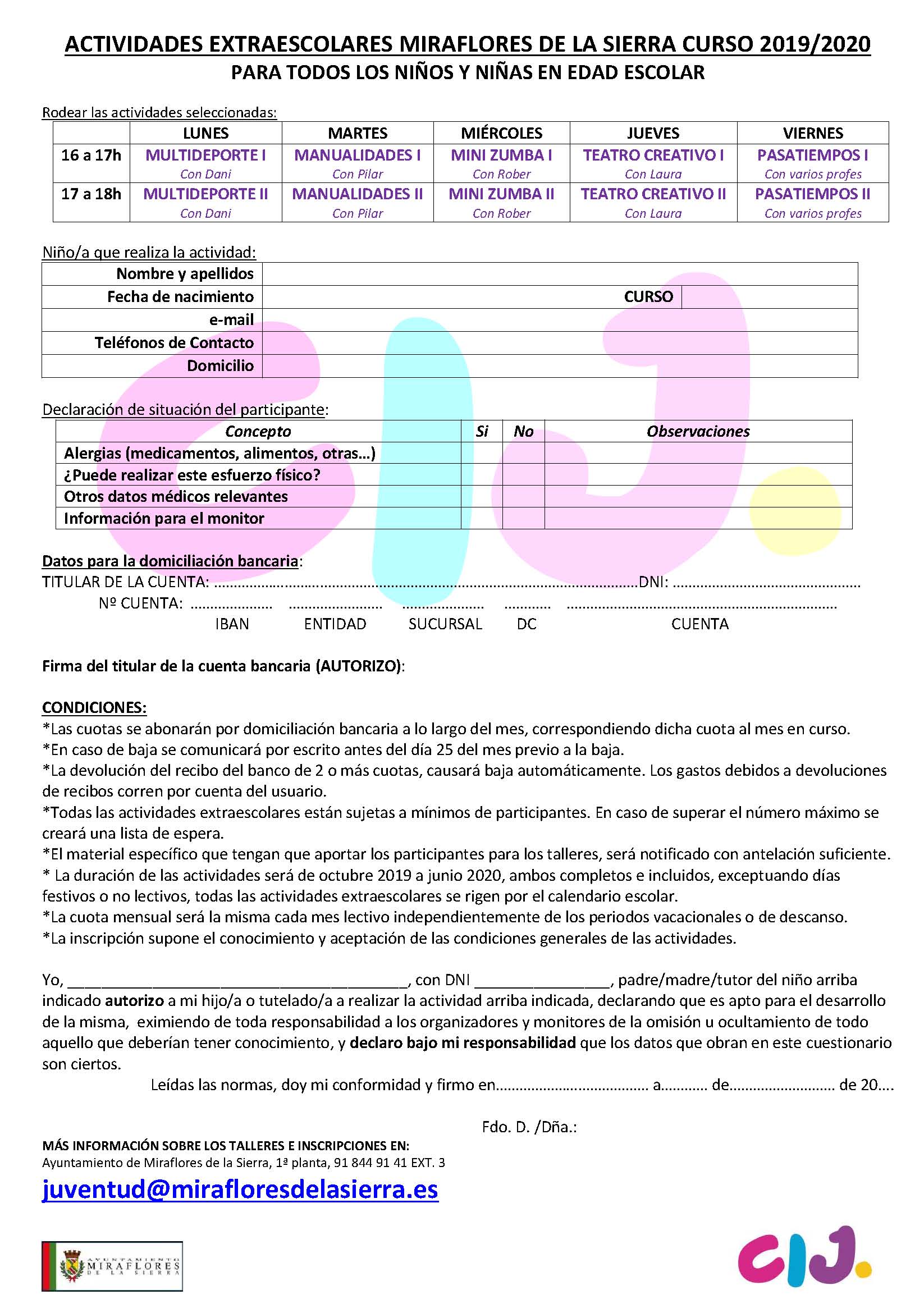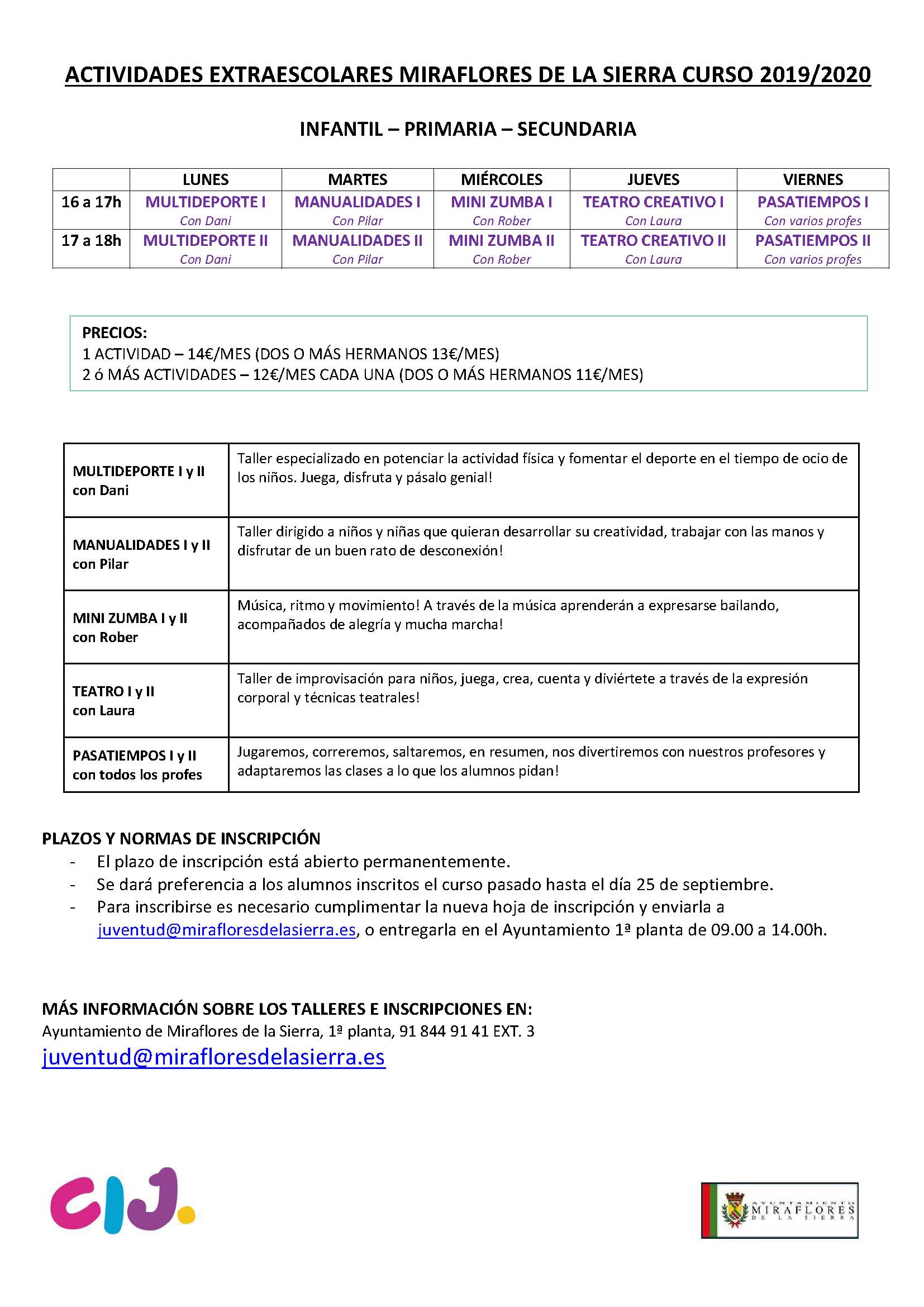 Desde la Concejalía de Infancia y Juventud del Ayuntamiento de Miraflores de la Sierra os trasladamos la información relativa a las “Actividades Extraescolares curso 2019/2020”:
