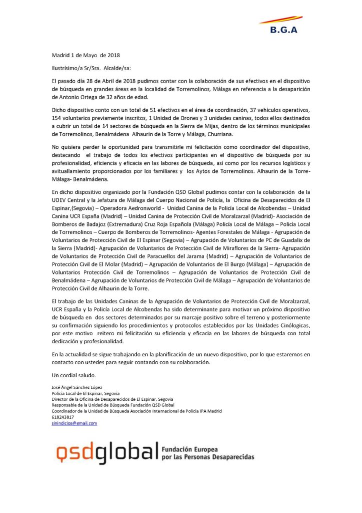 Agradecimiento a Protección Civil Miraflores por búsqueda de persona desaparecida en Torremolinos el 28 de abril de 2018