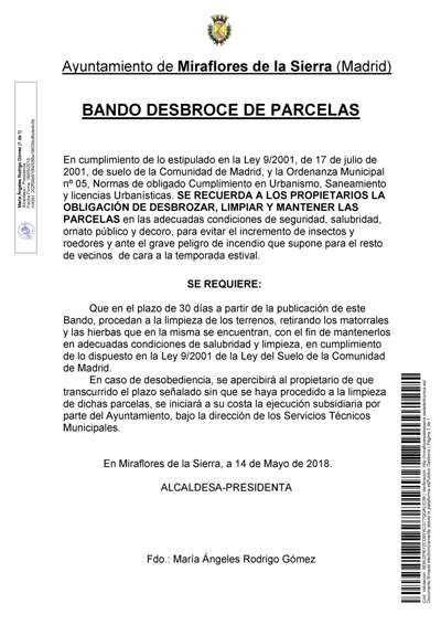 Bando Municipal sobre Desbroce de Parcelas. 27 mayo 2018