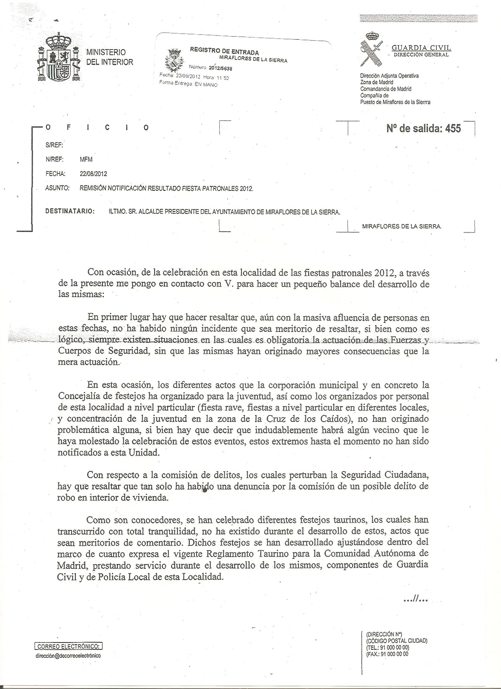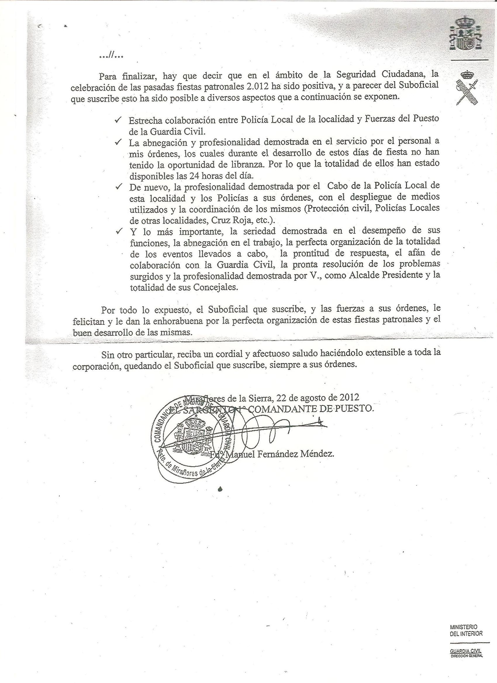 Carta remitida por el Sargento Comandante de Puesto de la Guardia Civil de Miraflores de la Sierra, dirigida al Alcalde Presidente del Ayuntamiento de Miraflores de la Sierra, como agradecimiento a la organización de las Fiestas Patronales.