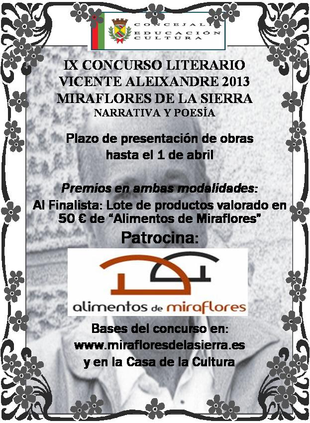 La Concejalía de Educación y Cultura convoca, un año más, el Concurso Literario Vicente Aleixandre Miraflores de la Sierra, de Narrativa y Poesía, que en este año 2013 celebra su IX edición.