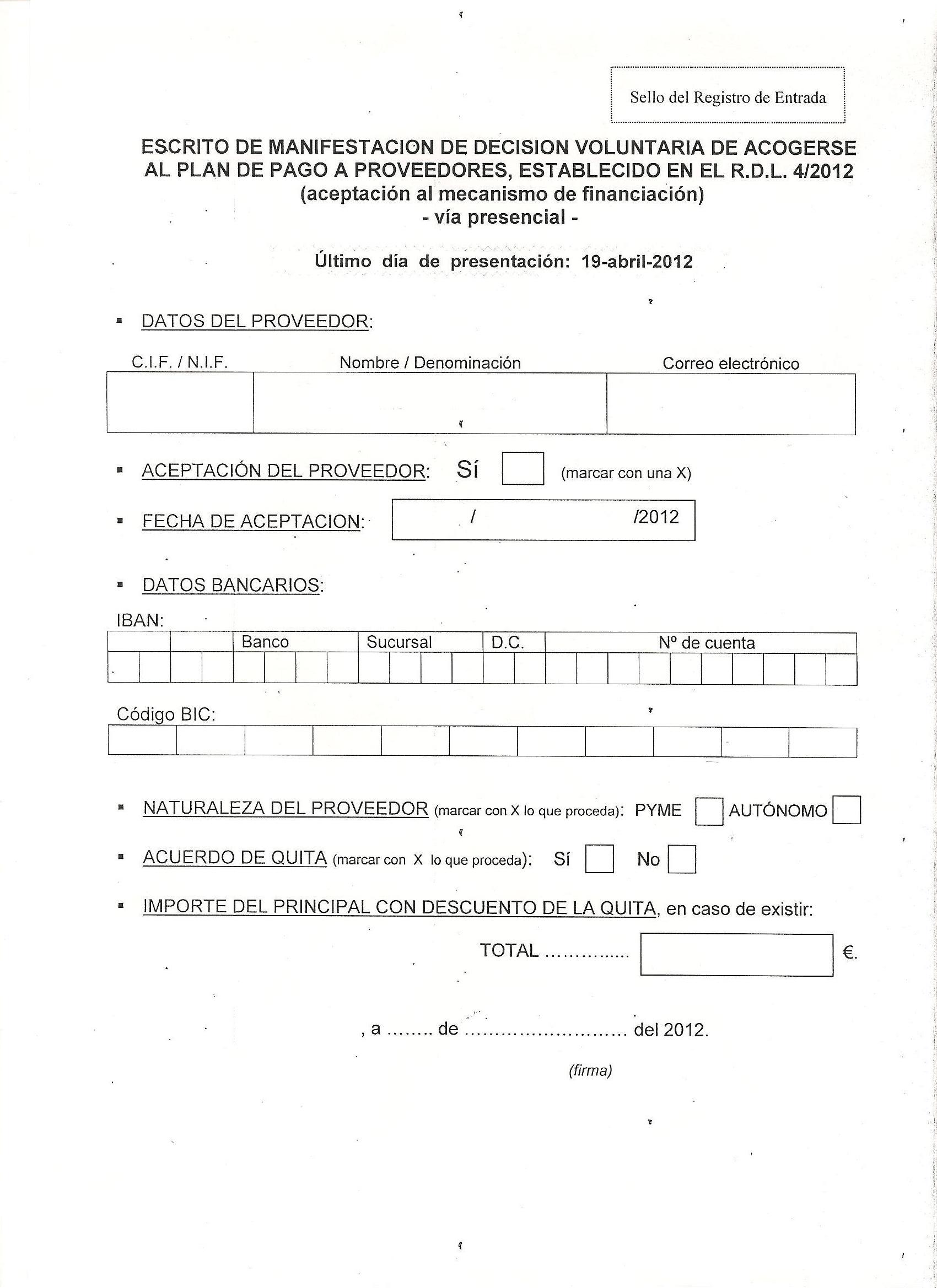 Escrito manifestación de decisión voluntaria de acogerse al plan de pago a proveedores, establecido en el R.D.L. 4/2012 – aceptación al mecanismo de financiación – Vía presencia – Último día de presentación: 19-abril-2012