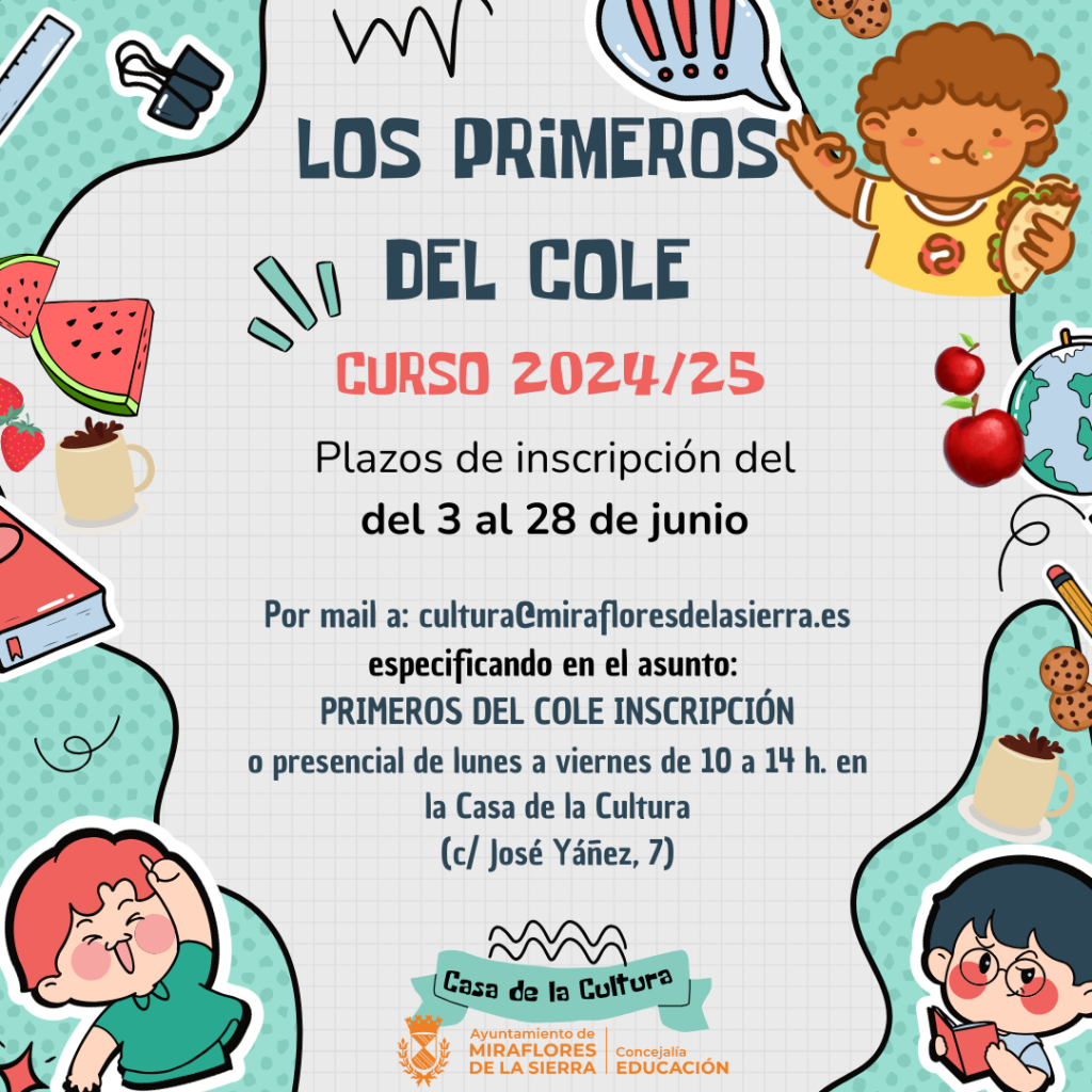 📩 Por mail a: cultura@mirafloresdelasierra.es (ASUNTO: «Primeros del cole inscripción»)