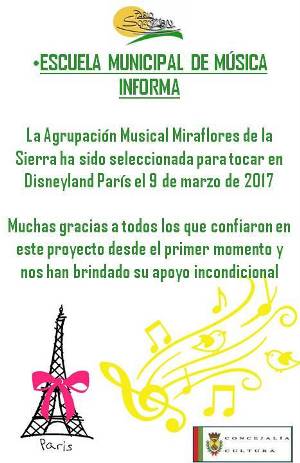 La Agrupación Musical Miraflores de la Sierra (Escuela Municipal de Música) tocará en Disneyland París el día 9 de marzo de 2017.