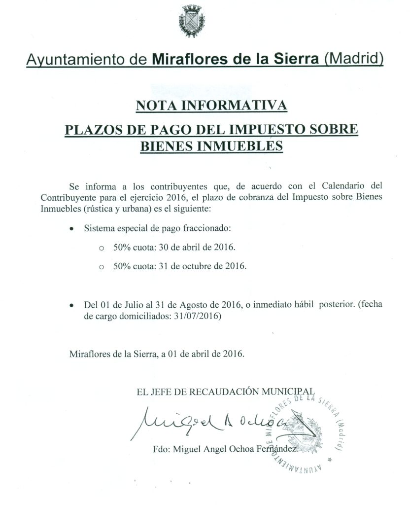 Nota informativa: Plazos de Pago del Impuesto sobre Bienes Inmuebles. Año 2016