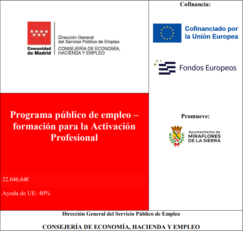 👉El Programa de Fomento de Empleo Juvenil con las Corporaciones Locales – Activación Profesional, cofinanciado por la Unión Europea a través de los Fondos Europeos y por la Consejería de Economía, Hacienda y Empleo de la Comunidad de Madrid, ha concedido una subvención de 22.646,64 € destinada a la contratación durante 8 meses de un puesto de periodista.