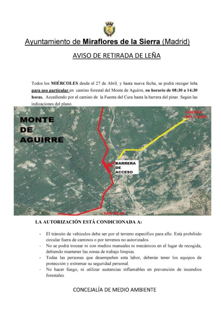 La Concejalía de Medio Ambiente informa que se abre el plazo para la recogida de leña de forma gratuita del Monte de Aguirre. Todos los miércoles desde el 27 de abril se podrá recoger esta leña de pino para uso particular en horario de 8:30 a 14:30 horas en el camino forestal del Monte de Aguirre. Se deberá acceder por el camino de la Fuente del Cura hasta la barrera del pinar como aparece en el plano.