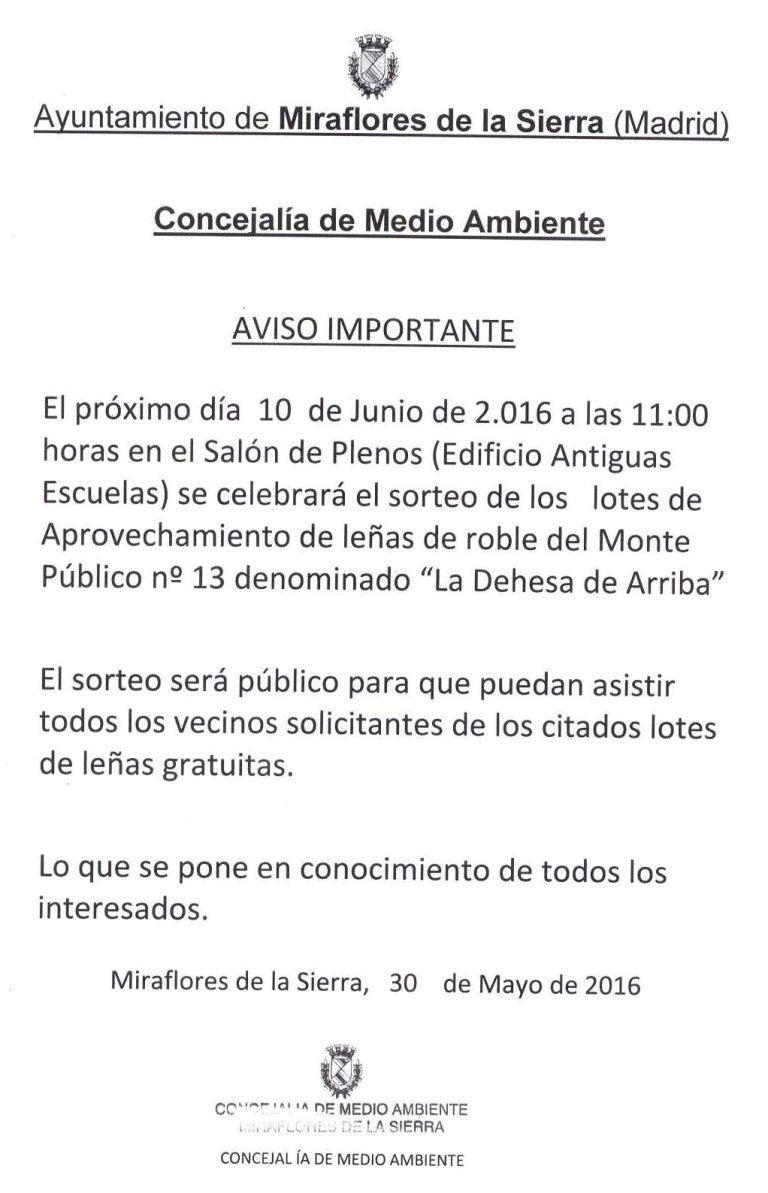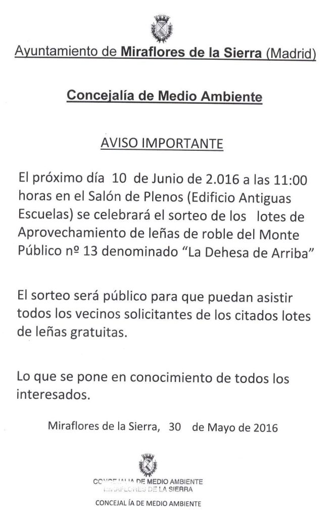 Sorteo Lotes de Aprovechamiento Leña Dehesa de Arriba: 10 junio