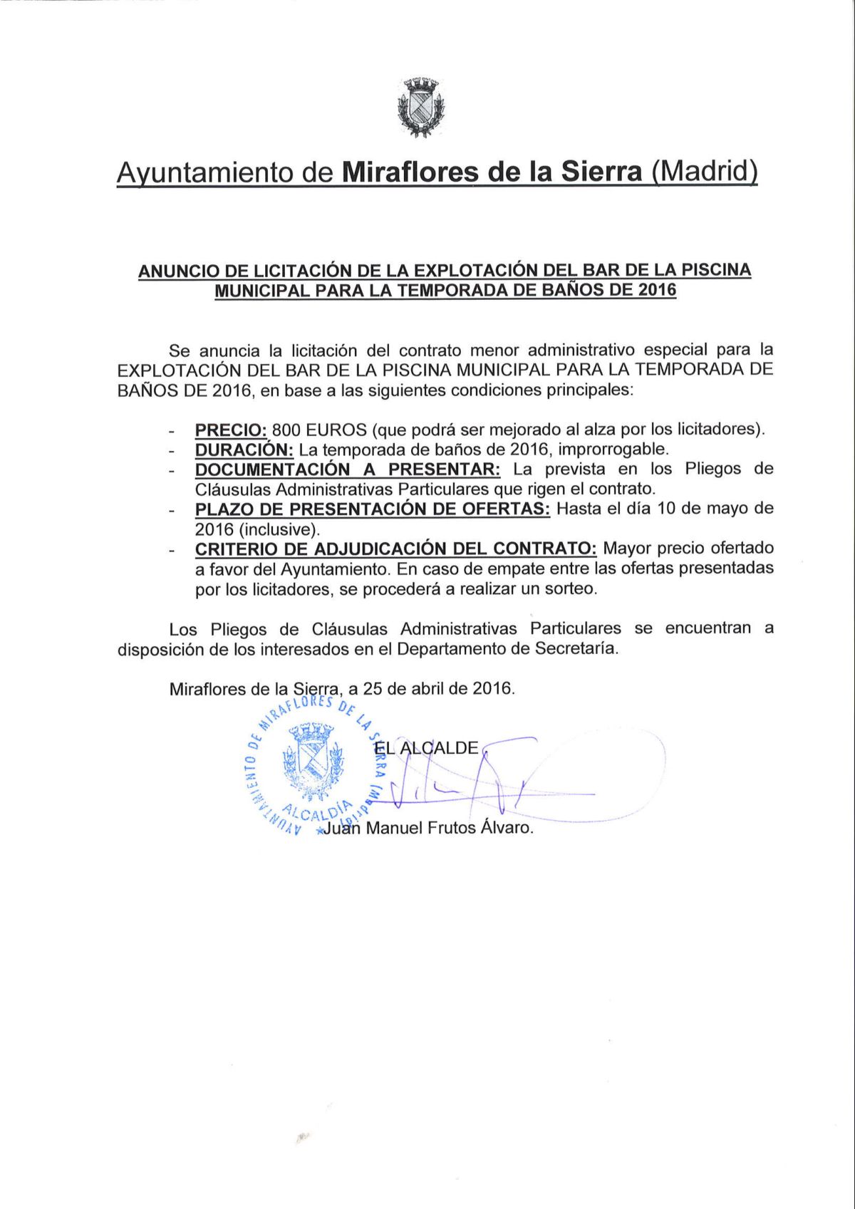 Anuncio y Pliego de Condiciones Licitación Explotación Bar Piscina Municipal Temporada Baños 2017 — 5 Mayo 2017