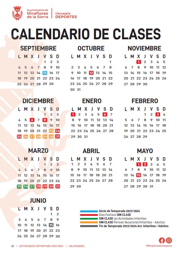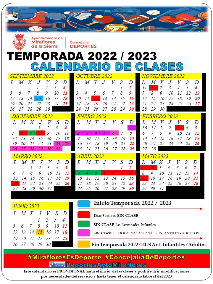 - La temporada se iniciará el 15 de Septiembre y terminará el 15 de Junio y las actividades de adultos se regirán por el Calendario de Clases, que publique la Concejalía de Deportes al inicio de cada curso.