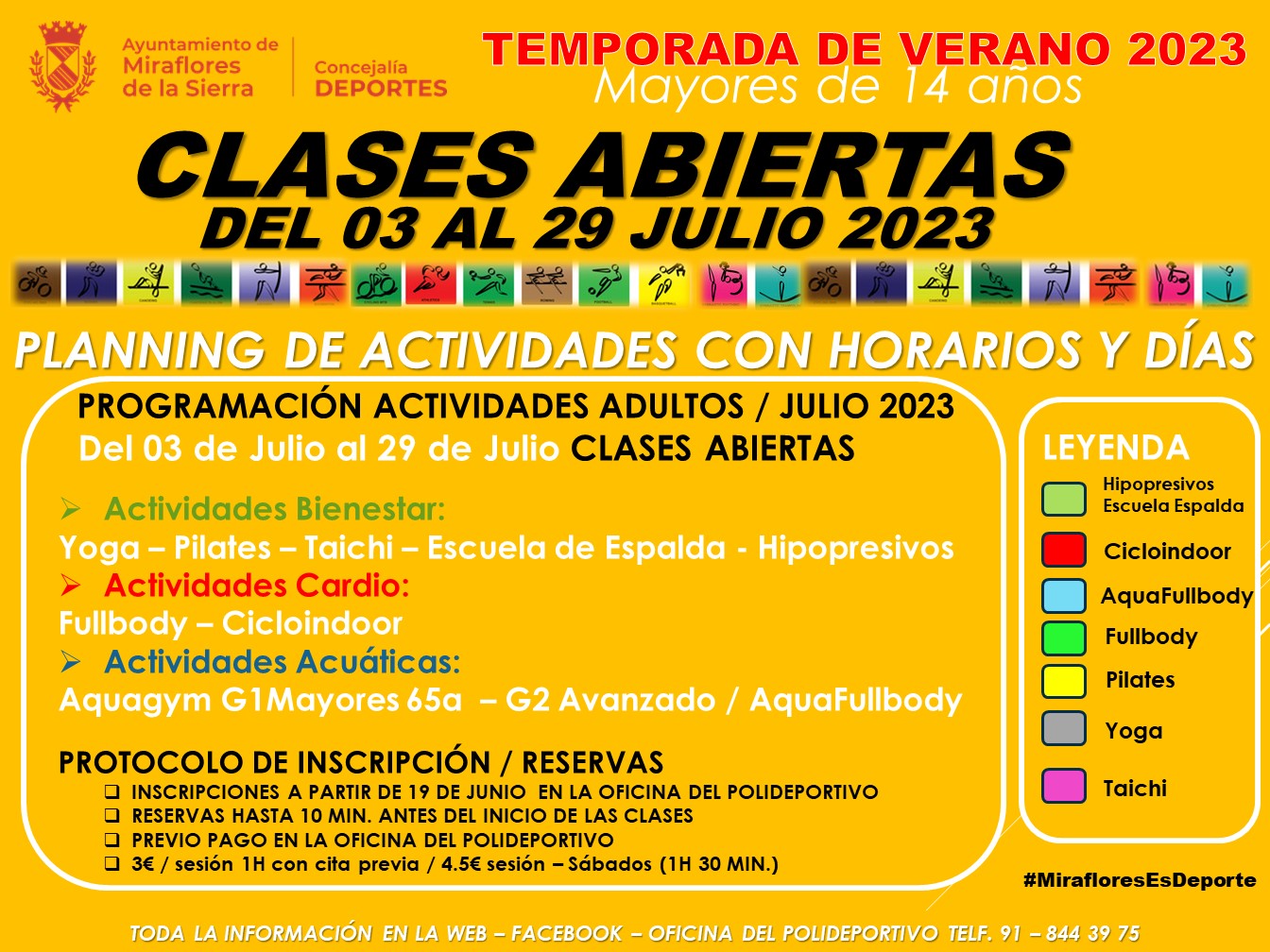 - Mayores de65 años No Empadronados en Miraflores de la Sierra: Acceso gratuito a la piscina municipal, 50% de descuento en el gimnasio de musculación y 50% de descuento en uno de los grupos de las actividades organizadas para dicho colectivo.