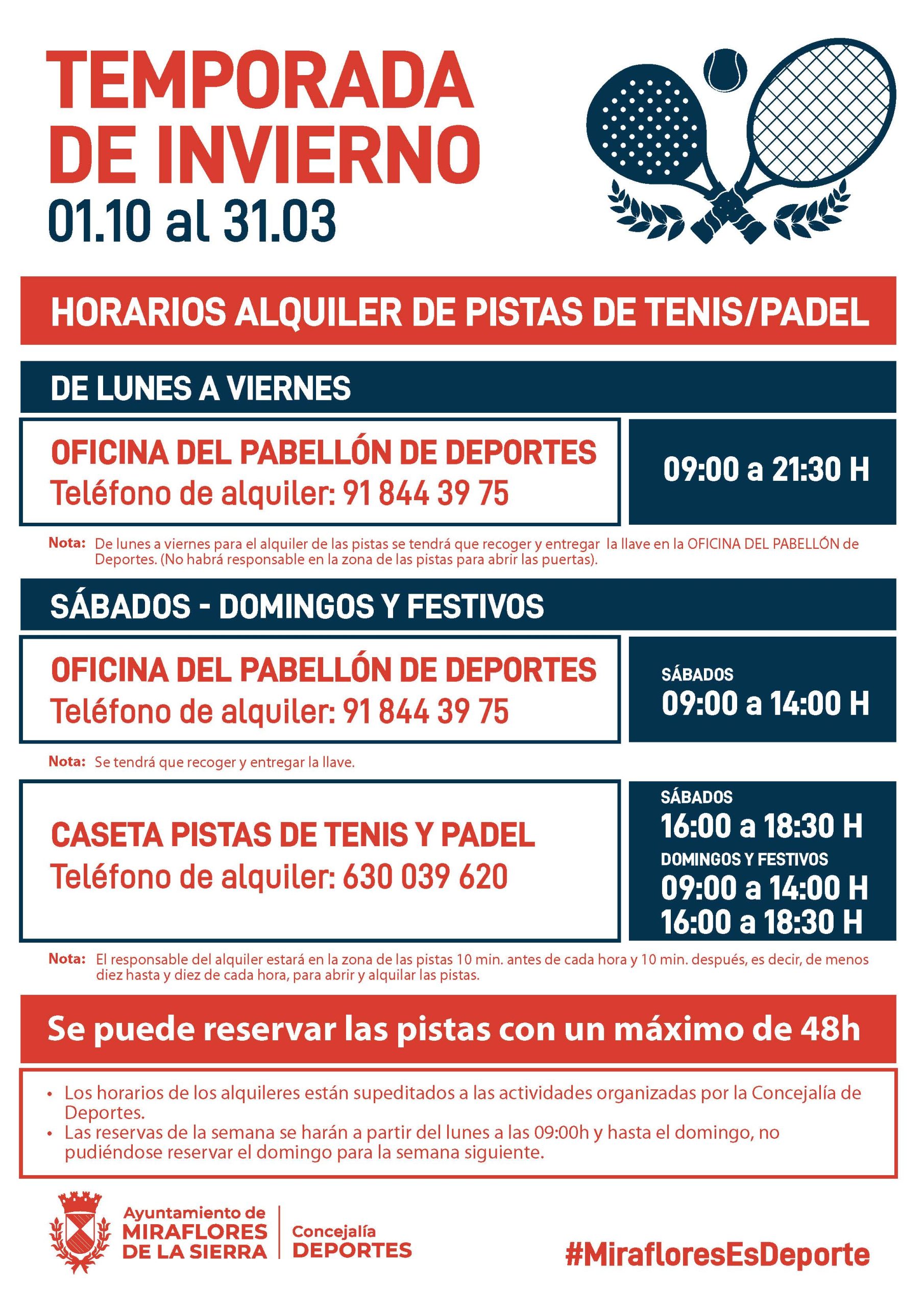 Alquiler-reservas pistas de tenis-pádel temporada de INVIERNO