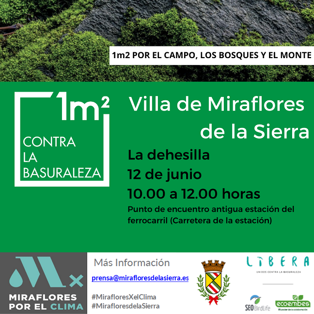 PROYECTO LIBERA 1M2: LA DEHESILLA El sábado 12 de junio nos adherimos a la propuesta de la Sociedad Española de Ornitología y Ecoembes para librar de basura parte de nuestro hermoso entorno natural. Se trató una vez más de unir fuerzas bajo el lema “Proyecto Libera 1 m2 Contra la Basuraleza”, una iniciativa de voluntariado medioambiental gracias a la cual limpiamos la zona de la Dehesilla. La cita fue el sábado 12 de junio en la antigua estación de ferrocarril de Miraflores de la Sierra y durante la jornada repetimos el éxito de convocatoria que ya tuvimos la primera vez que pusimos en marcha esta experiencia el pasado mes de marzo en la Cañada Real Segoviana a su paso por el arroyo Miraflores, donde un animado grupo de voluntarios libró de residuos (algunos de lo más insospechado) parte de ese entorno.